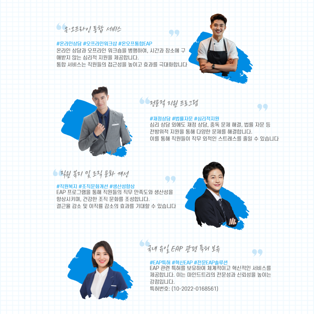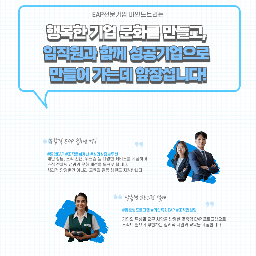 ¾È³çÇϼ¼¿ä, EAP Àü¹®±â¾÷ (ÁÖ)¸¶ÀÎµåÆ®¸® ÀÔ´Ï´Ù. ¸¶ÀÎµåÆ®¸®´Â ±â¾÷ÀÇ ¼º°ú¿Í Á÷¿øÀÇ ÇູÀ» µ¿½Ã¿¡ ÁõÁø½ÃŰ´Â ÅëÇÕÀû EAP(Employee Assistance Program) ¼Ö·ç¼ÇÀ» Á¦°øÇÕ´Ï´Ù. EAP µµÀÔÀ» °í·ÁÇϽô ±â¾÷ °ü°èÀںе鲲, ÀúÈñ ¼ºñ½ºÀÇ Â÷º°¼º°ú È¿°ú¸¦ ¼Ò°³µå¸®°íÀÚ ÇÕ´Ï´Ù. ¸¶ÀÎµåÆ®¸® EAP ¼ºñ½ºÀÇ Æ¯Â¡ 1. Á¶Á÷ ¸ÂÃãÇü ÅëÇÕ ¼Ö·ç¼Ç Á¦°ø ¸¶ÀÎµåÆ®¸®´Â ±â¾÷ÀÇ °íÀ¯ÇÑ Á¶Á÷ ¹®È¿Í ¿ä±¸ »çÇ×À» ¹Ý¿µÇÑ ¸ÂÃãÇü EAP ÇÁ·Î±×·¥À» ¼³°èÇÕ´Ï´Ù. ½É¸®Àû Áö¿ø¿¡ ±×Ä¡Áö ¾Ê°í, Á¶Á÷ Áø´Ü, ½ºÆ®·¹½º °ü¸®, °¥µî ÇØ°á, ±×¸®°í ±³À° ÇÁ·Î±×·¥±îÁö Æ÷°ýÀûÀ¸·Î Áö¿øÇÏ¿© Á¶Á÷ ³»ÀÇ ¹®Á¦¸¦ ±Ùº»ÀûÀ¸·Î ÇØ°áÇÕ´Ï´Ù. 2. ½É¸®Àû ¾ÈÁ¤°ú Á¶Á÷ ¼º°úÀÇ µ¿½Ã Çâ»ó EAP ÇÁ·Î±×·¥À» ÅëÇØ Á÷¿øµéÀÌ ½É¸®ÀûÀ¸·Î ¾ÈÁ¤µÈ »óÅ¿¡¼ ¾÷¹«¿¡ ¸ôÀÔÇÒ ¼ö ÀÖµµ·Ï Áö¿øÇÕ´Ï´Ù. ÀÌ´Â ÀÌÁ÷·ü °¨¼Ò, ¾÷¹« ¸¸Á·µµ Çâ»ó, »ý»ê¼º Áõ´ë µî ±â¾÷ÀÇ ¼º°ú¿¡µµ ±àÁ¤ÀûÀÎ ¿µÇâÀ» ¹ÌĨ´Ï´Ù. ¸¶ÀÎµåÆ®¸®ÀÇ EAP µµÀÔ »ç·Ê¸¦ ÅëÇØ, ½ÇÁ¦·Î Á÷¿øµéÀÇ ½É¸®Àû ¾ÈÁ¤ÀÌ ¾÷¹« È¿À²¼º Çâ»óÀ¸·Î À̾îÁ³À½À» È®ÀÎÇÒ ¼ö ÀÖ½À´Ï´Ù. 3. ¿Â¶óÀΰú ¿ÀÇÁ¶óÀÎÀÇ Á¶È·Î¿î ¼ºñ½º Á¦°ø ¿Â¶óÀÎ »ó´ãÀ» ÅëÇÑ Áï°¢Àû Áö¿ø°ú ´õºÒ¾î, ±â¾÷ ³»¿¡¼ Á÷Á¢ ÁøÇàµÇ´Â ¿ÀÇÁ¶óÀÎ ¿öÅ©¼¥ ¹× Ãâ° °ÀǸ¦ ÅëÇØ Á÷¿øµéÀÌ Á÷¹« ½ºÆ®·¹½º¸¦ °ü¸®ÇÏ°í ÆÀ¿öÅ©¸¦ °ÈÇÒ ¼ö ÀÖµµ·Ï µ½½À´Ï´Ù. ÀÌ·¯ÇÑ ¿Â¡¤¿ÀÇÁ¶óÀÎ ÅëÇÕ ¼ºñ½º´Â Á÷¿øµéÀÇ Á¢±Ù¼ºÀ» ³ôÀ̰í, ½É¸®Àû Áö¿øÀÇ È¿°ú¸¦ ±Ø´ëÈÇÕ´Ï´Ù. 4. ±â¾÷ Æ¯È ÄÁ¼³ÆÃ ¹× µ¥ÀÌÅÍ ±â¹Ý Á¢±Ù ¸¶ÀÎµåÆ®¸®´Â ±â¾÷ÀÇ °íÀ¯ÇÑ Á¶Á÷ ¹®È¸¦ ÀÌÇØÇϰí, À̸¦ ¹ÙÅÁÀ¸·Î µ¥ÀÌÅÍ ±â¹ÝÀÇ EAP ÄÁ¼³ÆÃÀ» Á¦°øÇÕ´Ï´Ù. Á÷¿øµéÀÇ ½É¸®Àû °Ç° »óÅÂ, Á¶Á÷ ³» °¥µî ¿ä¼Ò, ½ºÆ®·¹½º Áö¼ö µîÀ» ü°èÀûÀ¸·Î ºÐ¼®ÇÏ¿©, ¹®Á¦ ÇØ°áÀ» À§ÇÑ ¸ÂÃãÇü ¼Ö·ç¼ÇÀ» Á¦½ÃÇÕ´Ï´Ù. ÀÌ´Â ´Ü±âÀûÀÎ ¼º°ú»Ó¸¸ ¾Æ´Ï¶ó Àå±âÀûÀ¸·Îµµ ±â¾÷ÀÇ °æÀï·ÂÀ» °ÈÇÏ´Â µ¥ ±â¿©ÇÕ´Ï´Ù. 5. ±¹³» À¯ÀÏ EAP ƯÇã º¸À¯ ¸¶ÀÎµåÆ®¸®´Â EAP »ç¾÷ °ü·Ã ƯÇã(10-2022-0168561)¸¦ º¸À¯ÇÏ¿©, ü°èÀûÀ̰í Çõ½ÅÀûÀÎ EAP ¼ºñ½º¸¦ Á¦°øÇÕ´Ï´Ù. ÀÌ´Â ¸¶ÀÎµåÆ®¸®ÀÇ ¼ºñ½º°¡ ¾÷°è Ç¥ÁØÀ» ³Ñ¾î, º¸´Ù Àü¹®ÀûÀ̰í Â÷º°ÈµÈ ¼Ö·ç¼ÇÀ» Á¦°øÇÔÀ» ÀǹÌÇÕ´Ï´Ù. EAP µµÀÔÀ» ÅëÇØ ¾òÀ» ¼ö ÀÖ´Â È¿°ú - Á÷¿ø ¸¸Á·µµ ¹× ¸ôÀÔµµ Çâ»ó: ½É¸®Àû ¾ÈÁ¤ÀÌ È®º¸µÈ Á÷¿øµéÀº ´õ ³ôÀº ¾÷¹« ¸ôÀÔµµ¿Í ¼º°ú¸¦ º¸ÀÔ´Ï´Ù. - ÀÌÁ÷·ü °¨¼Ò ¹× ÀÎÀç À¯Áö: ½É¸®Àû Áö¿ø°ú Á¶Á÷ ¹®È °³¼±Àº Á÷¿øµéÀÇ Ãæ¼ºµµ¿Í ¾Ö»ç½ÉÀ» ³ô¿© ÀÌÁ÷·üÀ» ÁÙÀÌ´Â µ¥ ±â¿©ÇÕ´Ï´Ù. - Á¶Á÷ ¹®È ¹× ¾÷¹« ȯ°æ °³¼±: Áö¼ÓÀûÀÎ ±³À°°ú ¿öÅ©¼¥À» ÅëÇØ ±àÁ¤ÀûÀÌ°í °Ç°ÇÑ Á¶Á÷ ¹®È¸¦ ±¸ÃàÇÒ ¼ö ÀÖ½À´Ï´Ù. ¾î¶² °÷¿¡¼ ½Åû °¡´ÉÇѰ¡¿ä? - 1ÀÎ ±â¾÷~´ë±â¾÷ - ¹Î°£±â¾÷, °ø°ø±â¾÷ - ºÎ¼ ¶Ç´Â ÆÀº°(µ¿¾Æ¸® ¸ðÀÓ) - ¼Ò»ó°øÀÎ µî ¸¶ÀÎµåÆ®¸®¿Í ÇÔ²²Çϼ¼¿ä ¸¶ÀÎµåÆ®¸®´Â ½É¸®Àû Áö¿øÀ» ³Ñ¾î, Á¶Á÷ÀÇ ¼º°ú Çâ»ó°ú ±â¾÷ ¹®È °³¼±À» ¸ñÇ¥·Î ÇÏ´Â ÅëÇÕÀû EAP ¼Ö·ç¼ÇÀ» Á¦°øÇÕ´Ï´Ù. °Ç°ÇÑ ±â¾÷ ¹®È¸¦ Á¶¼ºÇϰí, Á÷¿øµéÀÇ Çູ°ú ¼ºÀåÀ» Áö¿øÇϰíÀÚ ÇÏ´Â ±â¾÷À̶ó¸é, ÀúÈñ ¸¶ÀÎµåÆ®¸®¿Í ÇÔ²² »õ·Î¿î °¡´É¼ºÀ» ¿¾î°¡½Ã±æ ¹Ù¶ø´Ï´Ù. ±Ã±ÝÇϽŠÁ¡ÀÌ ÀÖ³ª¿ä? ÀÚ¼¼ÇÑ ³»¿ëÀ̳ª Ãß°¡ »ó´ãÀÌ ÇÊ¿äÇÏ½Ã´Ù¸é ¾ðÁ¦µçÁö ÀúÈñ¿¡°Ô ¿¬¶ôÇØ ÁÖ¼¼¿ä. ¿©·¯ºÐÀÇ ±â¾÷°ú ÇÔ²² ´õ ³ªÀº ³»ÀÏÀ» ¸¸µé¾î°¡±æ ±â´ëÇÕ´Ï´Ù. EAP Àü¹®±â¾÷ (ÁÖ)¸¶ÀÎµåÆ®¸® ÀüÈ: 050-6861-3270 À̸ÞÀÏ: growth@mindtree7.com °¨»çÇÕ´Ï´Ù. ![]() ![]() ![]()